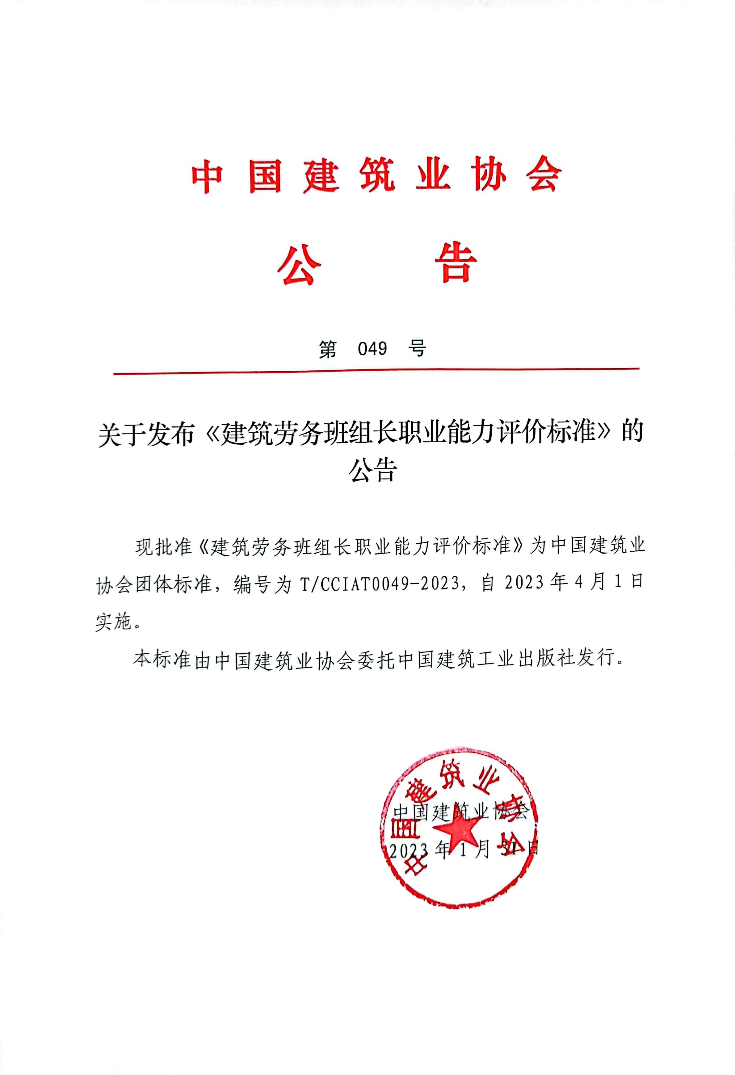 關于發布《建筑勞務班組長職業能力評價標準》的公告
