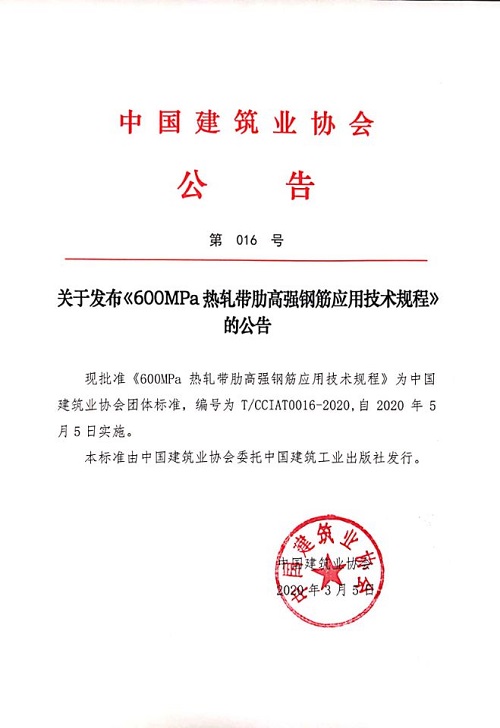 關(guān)于發(fā)布《600MPa熱軋帶肋高強鋼筋應(yīng)用技術(shù)規(guī)程》的公告