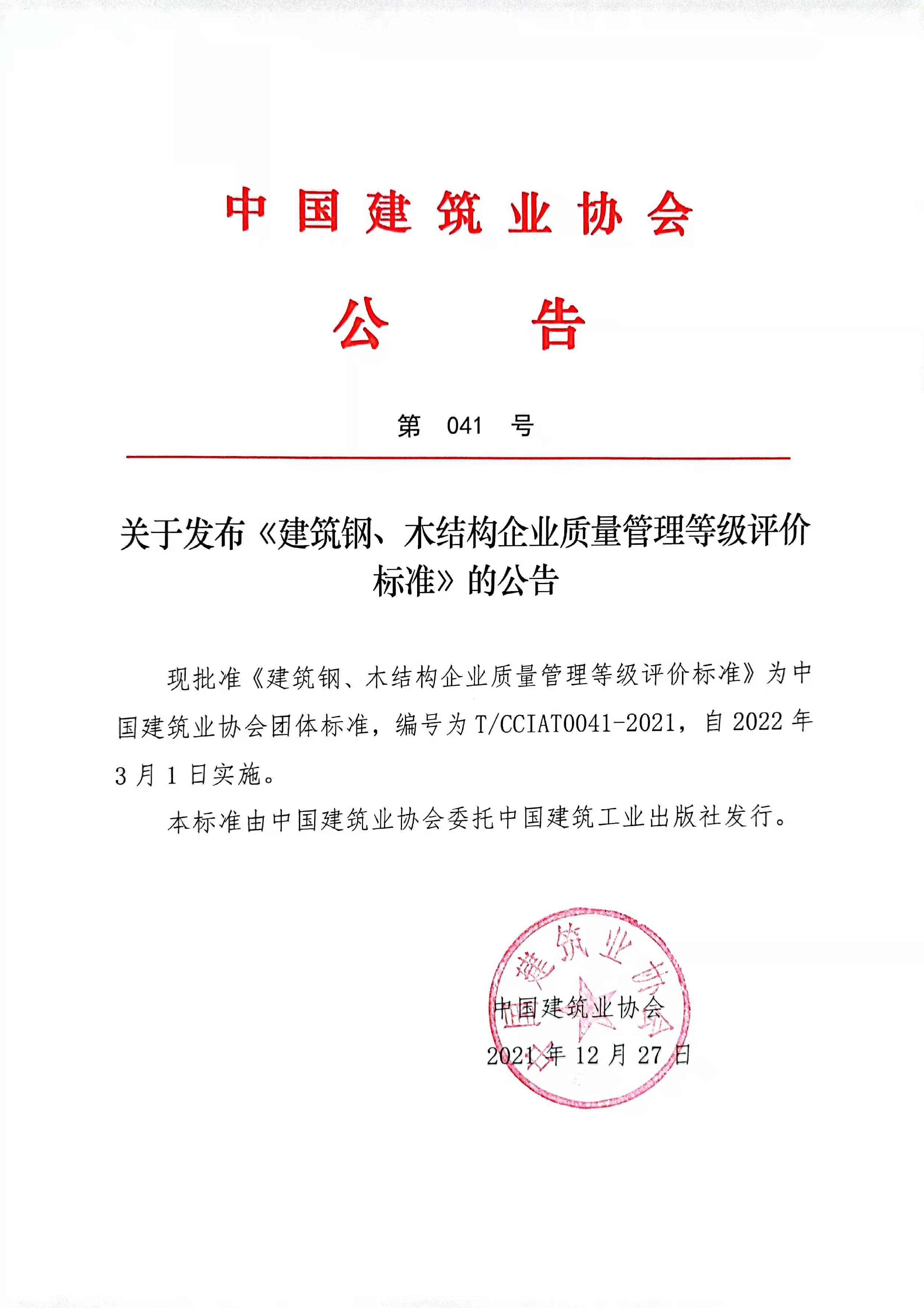 關(guān)于發(fā)布《建筑鋼、木結(jié)構(gòu)企業(yè)質(zhì)量管理等級評價(jià)標(biāo)準(zhǔn)》的公告