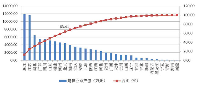 除浙江、江蘇兩省外,總產值超過4000億元的還有湖北、廣東、四川、山東、福建、河南和北京共7個地區,上述9省市完成的建筑業總產值占全國建筑業總產值的63.41%(圖1)。