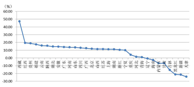 從各地區建筑業總產值增長情況看,有23個地區的建筑業總產值較上年同期有不同幅度的增長。其中,西藏、江西、貴州、福建、云南、陜西的增幅均超過15%。有8個地區出現負增長,其中,天津、新疆、黑龍江、吉林出現了15%以上的負增長(圖2)。