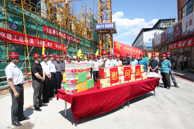 6月18日,正值端午佳節來臨之際,頂著炎炎烈日,北京建工集團房地產公司和建工四建公司的黨政工團領導來到北京市最搶手的自主商品房——建工•動力港(朝陽區百子灣路14號項目部)工地,看望慰問在高溫中施工的一線建設者們,為200多名保障房建設者送來了粽子、豬肉、綠豆、白糖、礦泉水等貼心的慰問品。