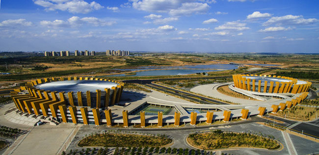 鄂爾多斯市體育中心工程是第十屆全國少數民族傳統體育運動會主會場,為大型甲級體育建筑群,包括體育場、體育館和游泳館“一場兩館”,總建筑面積約25.9萬m2,自2012年3月開工啟動,歷時三年全部建造完成。其中,由河北建設集團負責施工的游泳館工程位于體育中心最東側,總建筑面積約4.8萬m2,合同造價約5.6億元,是該集團迄今承建的規模最大的體育場館類單體項目。
