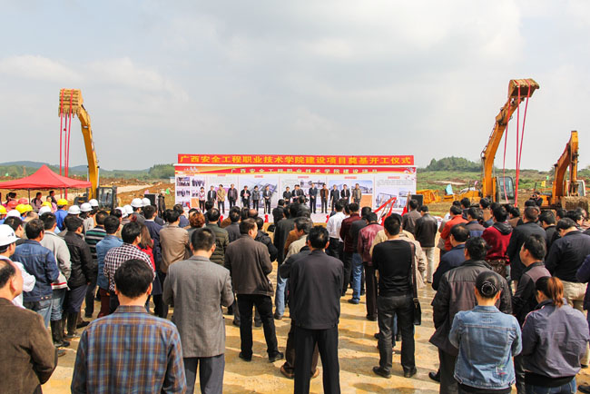 該項目由自治區安監局黎志逘局長宣布正式開工。廣西建工一建董事長蒙貴飛在開工儀式上表示,將不負重任,高度重視,組建EPC領導小組,精選善打硬戰、技術過硬的施工管理團隊,與參建各方精誠合作,努力將項目打造為精品工程、標桿工程。在一片喜慶的鞭炮聲中,出席開工儀式的領導、嘉賓南寧市副市長覃衛國,集團公司市場經營部部長駱春燕及集團投發部副部長黃鳴、公司副總經理覃振華共同為項目培土奠基。