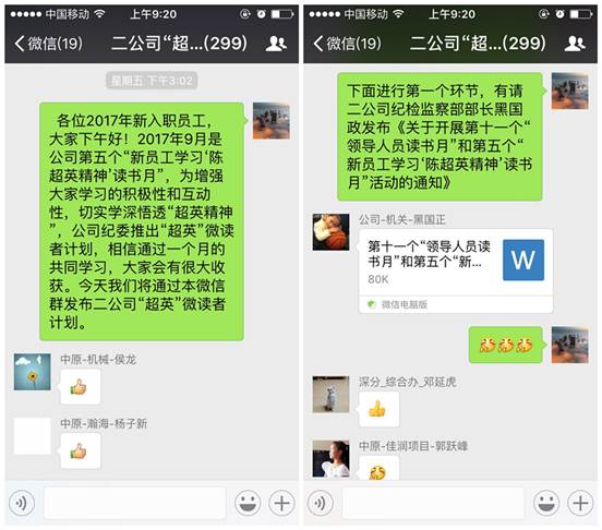 今年9月份是二公司第五個新員工學(xué)習(xí)“陳超英精神”讀書月,相比以往,今年通過微信群發(fā)布“超英微讀者計劃”活動,作為二公司首次推出的基于微信社群的讀書活動,“超英微讀者計劃”一經(jīng)推出即贏得了廣泛好評,新員工紛紛點贊,踴躍參加。活動通過發(fā)布每日話題,開展主題討論,邀請公司領(lǐng)導(dǎo)、優(yōu)秀業(yè)務(wù)骨干開展專題講座、互動交流及知識問答等環(huán)節(jié)增強整個活動的趣味性,應(yīng)用微信管家輔助軟件記錄群成員的活躍情況,并通過“微積分”方式建立學(xué)習(xí)成長卡,作為后期“超英微讀者計劃”閱讀小達(dá)人評選依據(jù),切實增強全員閱讀的積極性。