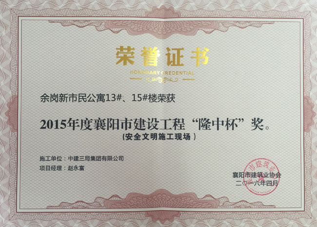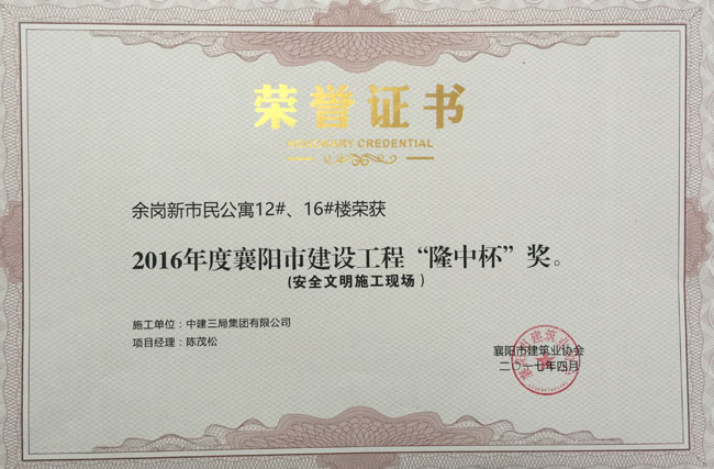 2014年8月開工至今,襄陽余崗新市民公寓項目13#、15#樓榮獲2015年度襄陽市安全文明施工現場,12#、16#樓榮獲2016年度襄陽市安全文明施工現場。至此,項目已連續三年獲得安全文明施工現場榮譽。