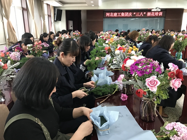 3月8日上午,河北建工集團六樓會議室,70多名女職工置身鮮花叢中,用心學習鮮花養護知識、花語以及插花技巧。