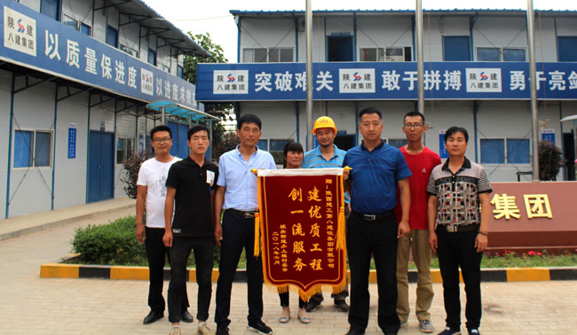 6月7日下午,銅川市耀州區上樓村兩委干部和群眾代表來到陜建八建集團承建的陜西建工(銅川)新型材料工業園工地,為項目部送來了一面“建優質工程,傳一流服務”的錦旗,感謝陜建八建集團為村子和村民們化解難題。