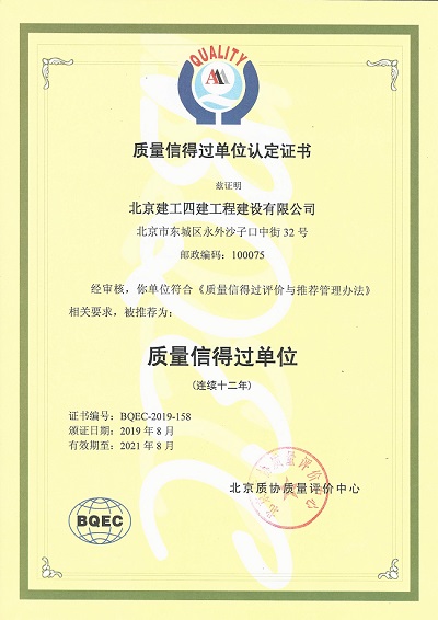 近日,經北京質協質量評價中心審核,北京建工四建工程建設有限公司符合《質量信得過評價與推薦管理辦法》相關要求,連續12年被認定為“質量信得過單位”,有效期兩年,至2021年8月,這充分體現了四建公司在工程質量管理工作方面的高水平和高標準。