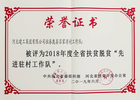 日前,河北建工集團駐涿鹿縣呂家灣村工作隊被河北省委組織部、河北省扶貧開發辦公室授予2018年度全省扶貧脫貧“先進駐村工作隊”稱號。