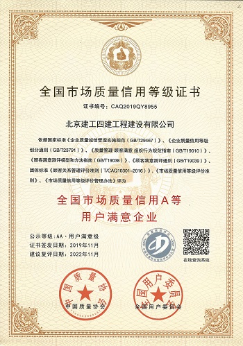 近日,在企業自愿申請的基礎上,經市場用戶評價,(采用CCSI模型,滿意度指數80%以上)、推薦機構推薦、第三方信用評價機構評價和專業機構評審后,北京建工四建公司(以下簡稱“四建公司”)被中國質量協會評為2019年全國市場質量信用A等(用戶滿意)企業。
