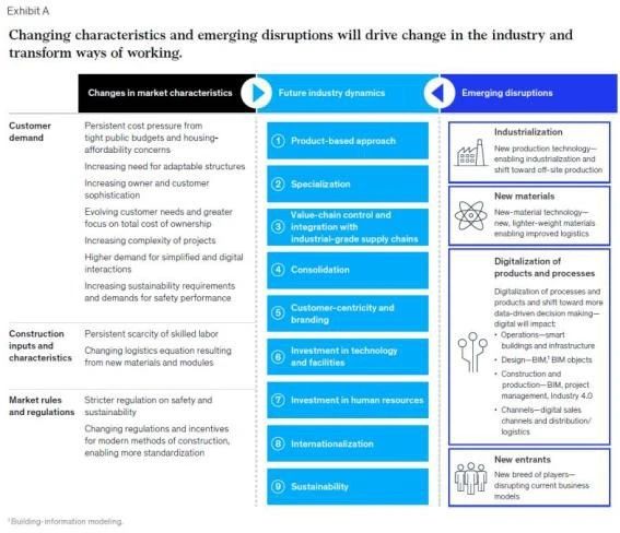 The construction industry was already starting to experience an unprecedented rate of disruption before the COVID-19 pandemic. In the coming years, fundamental change is likely to be catalyzed by changes in market characteristics, such as scarcity of skilled labor, persistent cost pressure from infrastructure and affordable housing, stricter regulations on work-site sustainability and safety, and evolving sophistication and needs of customers and owners. Emerging disruptions, including industrialization and new materials, the digitalization of products and processes, and new entrants, will shape future dynamics in the industry (Exhibit A).