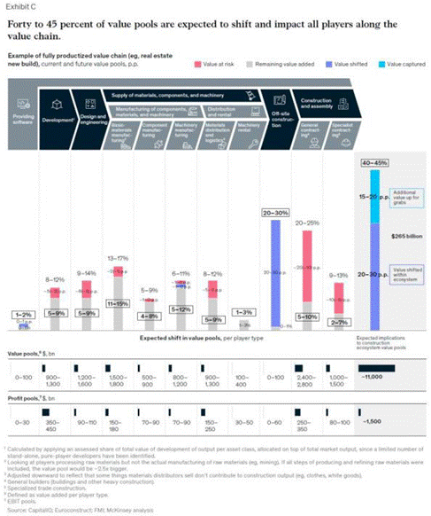 有些公司受影響更大。軟件供應商預計將顯著增加其增加值貢獻率,盡管是從占價值鏈1%到2%的小基數基礎增加。此外,預計會有很大一部分價值從建筑工地轉移到非現場預制工廠。相比之下,除非總承包商和專業分包商重新自我定位,將自己發展為執行能力卓越的公司,否則可能會面臨很大的利潤下滑。基本的工程設計及材料分銷和物流可能會面臨大量商品化和自動化風險。