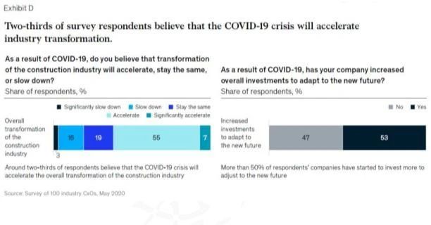 建筑業的全面轉型可能需要數十年的時間,但是這一過程已經開始。我們的調查顯示,行業領導者在很大程度上認可這一點,本報告中概述的變化可能在未來5到10年內大規模發生,并且新冠肺炎疫情將加速這一變化。