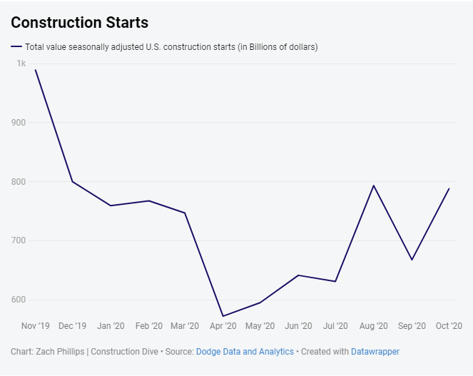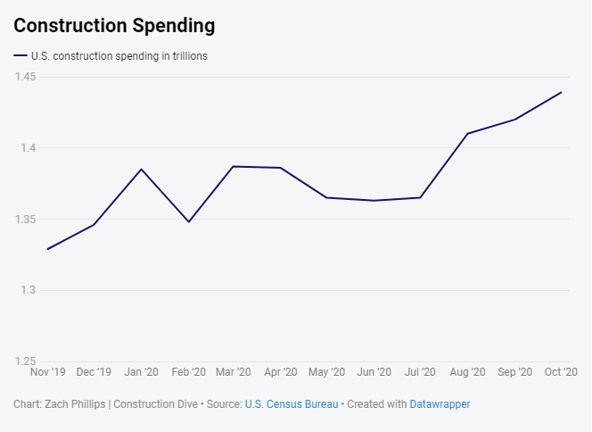 There are a number of reports and outlets that help experts and executives keep their finger on the pulse of the construction industry. Curated by the Construction Dive staff, this page centralizes data from those resources and helps visualize it as a one-stop resource about construction industry spending, hiring, starts and billings. This construction industry data page is updated bimonthly.