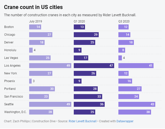 Twice a year, Rider Levett Bucknall collects data on the number of cranes in North American cities. This can be an indicator of the health of the construction market, specifically for high rises and multi-family construction. Here, Construction Dive displays the change in the number of cranes counted in U.S. cities from RLB's reports.